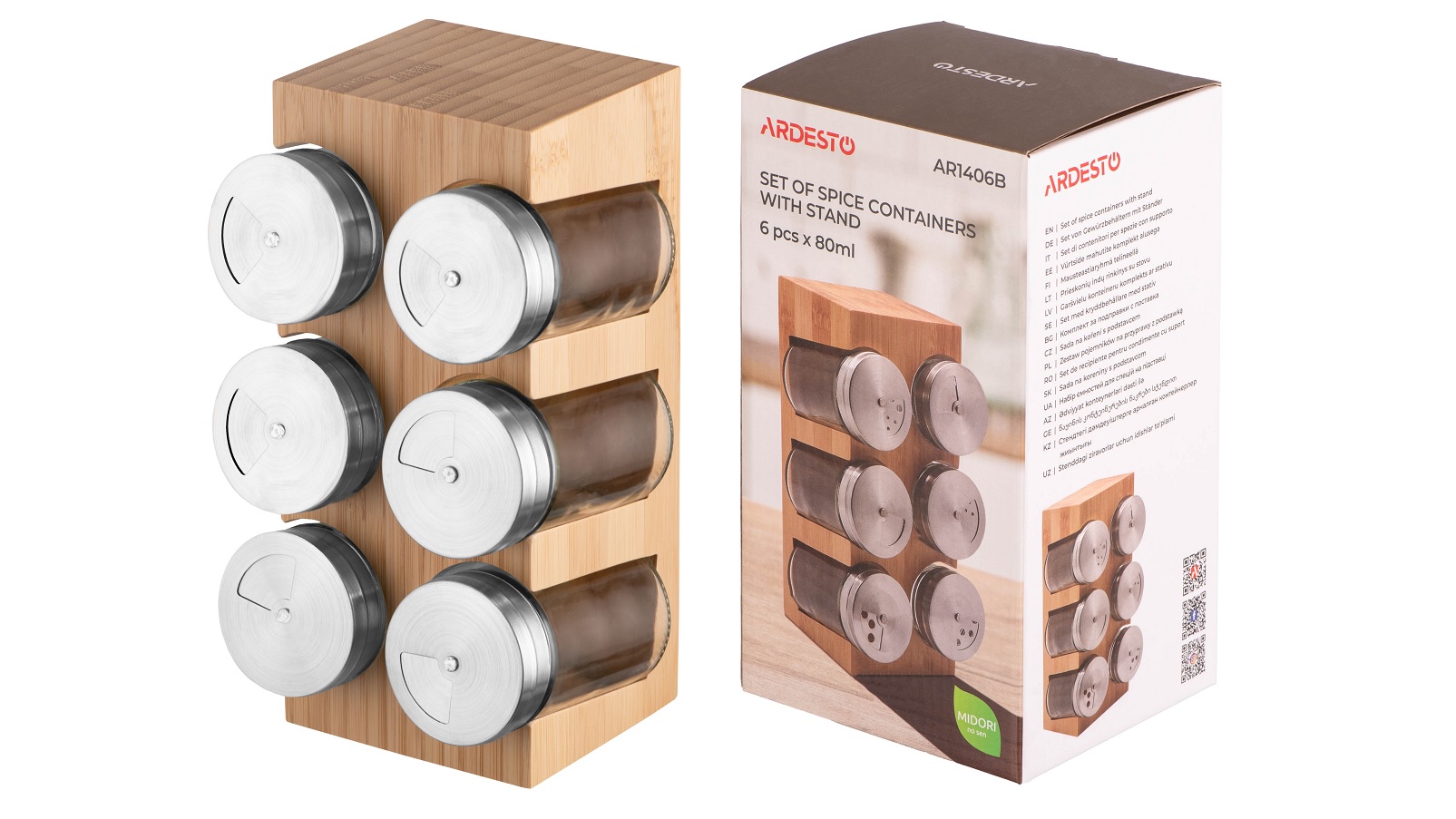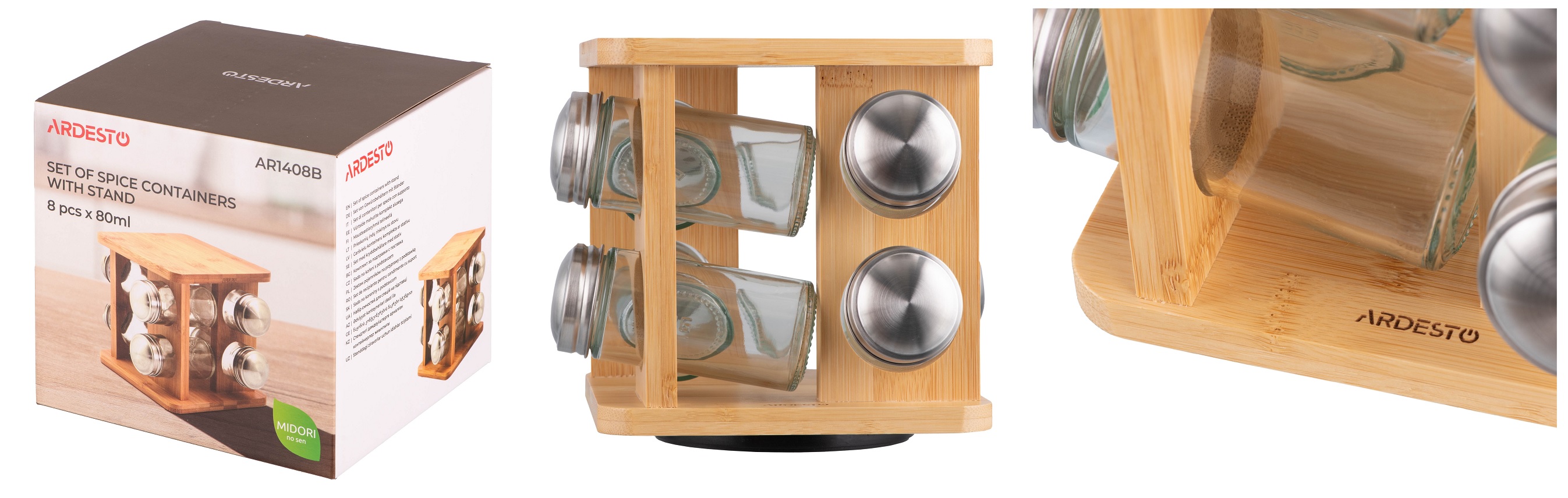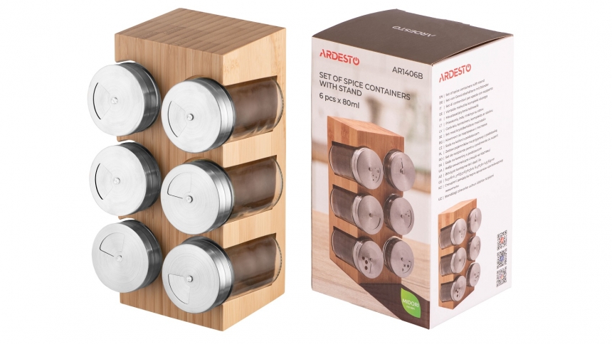 Набори ємностей для спецій на підставці ARDESTO Midori формують окрему, чітко структуровану зону. Приправи завжди напохваті, не займають зайвого місця та не розпорошуються на різних полицях, що спрощує процес готування. Ємності виготовлено з якісної нержавіючої сталі, скла та пластику – матеріалів, які не вбирають запахи, примітні міцністю та розраховані на тривале використання. Підставка з бамбука, екологічного матеріалу, слугує практичним рішенням для організації простору та забезпечує швидкий доступ до приладдя.