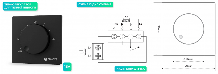 Терморегулятор Navin EH84BM-16A керує електричною теплою підлогою за допомогою механічного поворотного регулятора з діапазоном 5–35°C. Накладний монтаж на стіну спрощує встановлення, а матовий чорний корпус вписується в сучасні інтер'єри. Вбудований захист від перегріву та датчик NTC забезпечують стабільну роботу, з можливістю перемикання між режимами нагріву та охолодження.