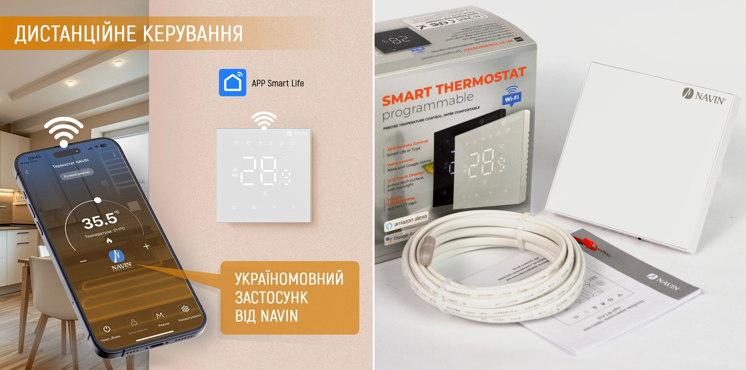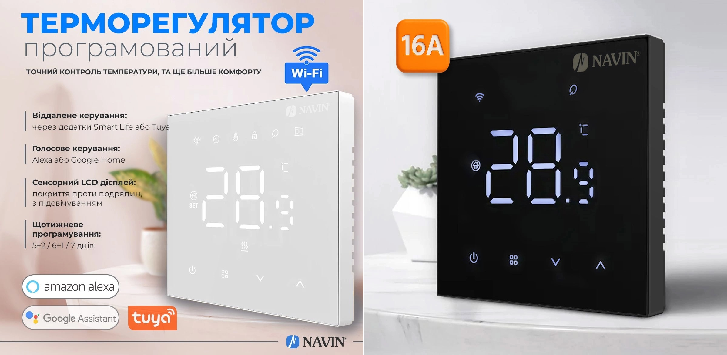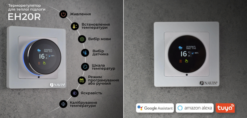 Лінійка терморегуляторів Navin дає змогу підібрати рішення як для базового керування електричним опаленням, так і для його повноцінної інтеграції в систему «розумного дому». Усі сучасні Wi-Fi моделі підтримують дистанційне керування через мобільні застосунки Tuya або Smart Life, а також взаємодіють із голосовими помічниками Google Home та Amazon Alexa, що значно розширює сценарії використання електричного опалення.