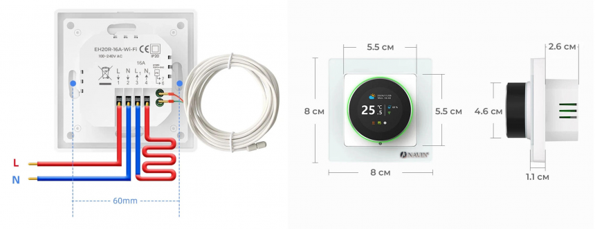 Терморегулятор Navin EH20R-16A забезпечує точне керування електричною теплою підлогою через Wi-Fi та застосунок Tuya або Smart Life. Обертовий регулятор з TFT-дисплеєм дозволяє легко налаштовувати температуру вручну, а програмований режим оптимізує енергоспоживання. Датчик температури NTC гарантує точність вимірювання до ±0,1°C, з додатковими функціями захисту від перегріву та дітей.