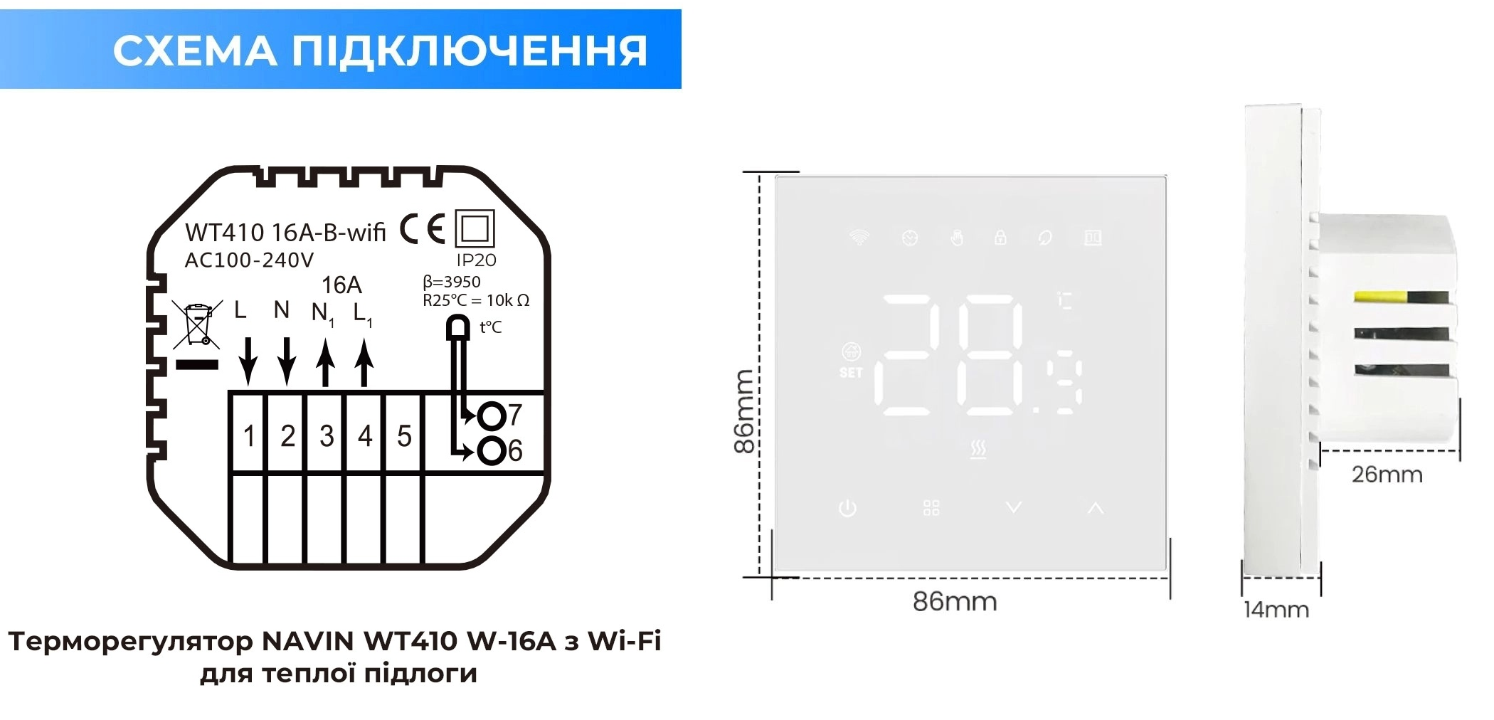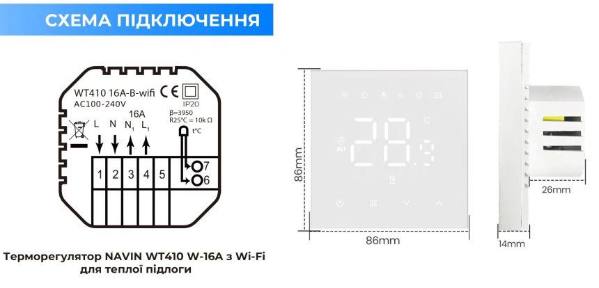 Терморегулятор Navin WT410B-16A керує електричною теплою підлогою через сенсорний LCD-дисплей та Wi-Fi-з’єднання з застосунками Tuya або Smart Life. Підтримує тижневе програмування в режимах 5+2, 6+1 або 7 днів, а також голосове керування через Amazon Alexa та Google Home. Зовнішній датчик NTC довжиною 3 м забезпечує точність вимірювання ±0,1°C, з функціями захисту від дітей та автоматичного відновлення налаштувань після відключення живлення.