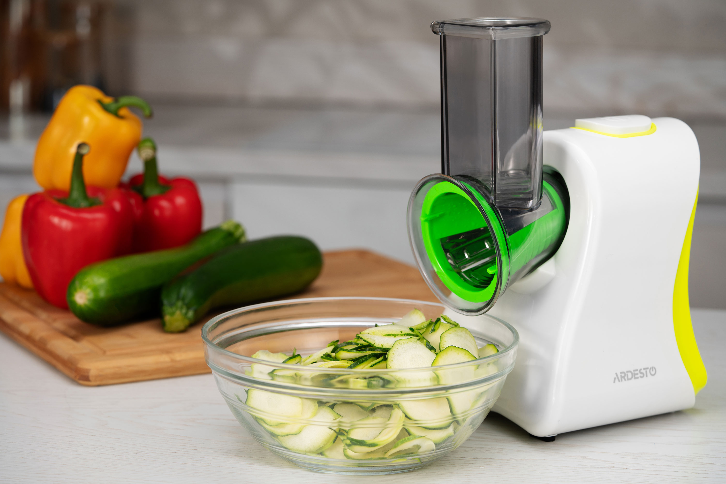 ARDESTO CHK-G200W: мультирізка 200 Вт із чотирма насадками для шаткування, нарізання та подрібнення. Дає рівномірний результат без ручного нарізання, що актуально для салатів і гарнірів.