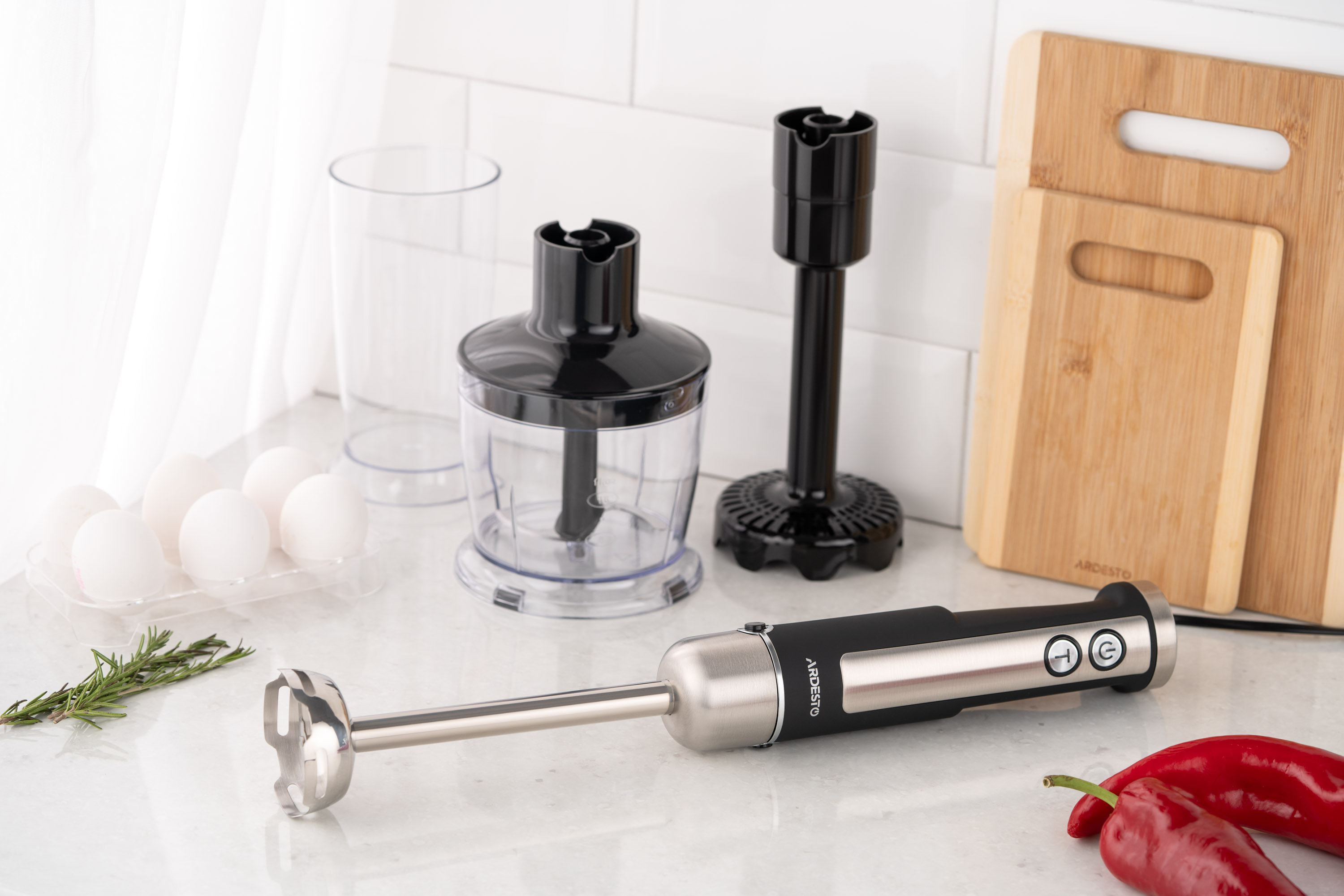 Заглибний блендер ARDESTO HBG-1000BCHP (1 000 Вт): універсальний пристрій 3 в 1. Чаша 600 мл, чопер 500 мл і насадка для пюре дають змогу працювати з різними консистенціями: крем-супи, соуси, паштети, дитяче меню.
