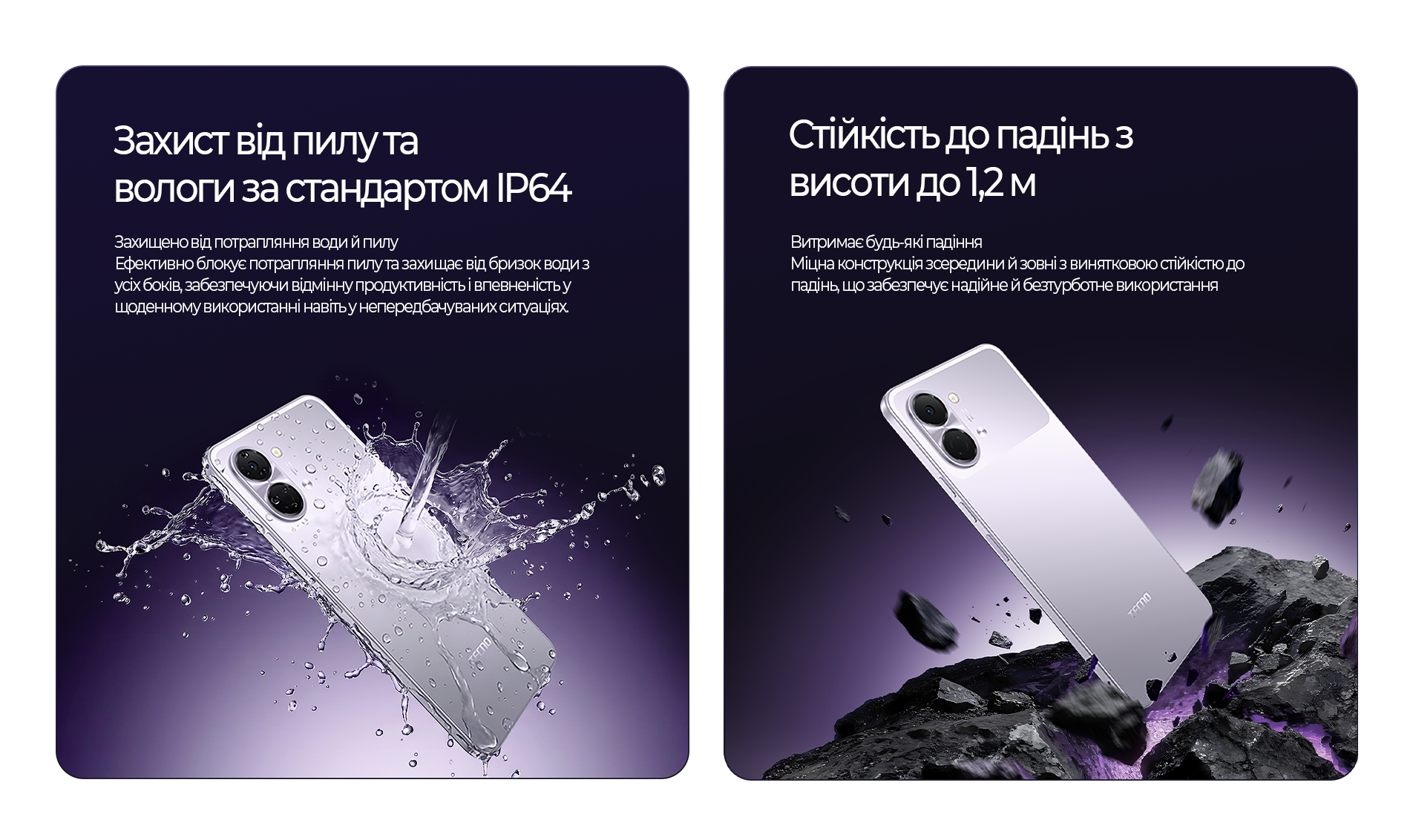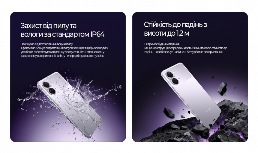 Корпус відповідає стандарту IP64 – передбачено захист від пилу та бризок води з усіх боків. Посилена конструкція витримує падіння з висоти до 1,2 м. Це типові ситуації під час використання смартфона в русі або в побуті.