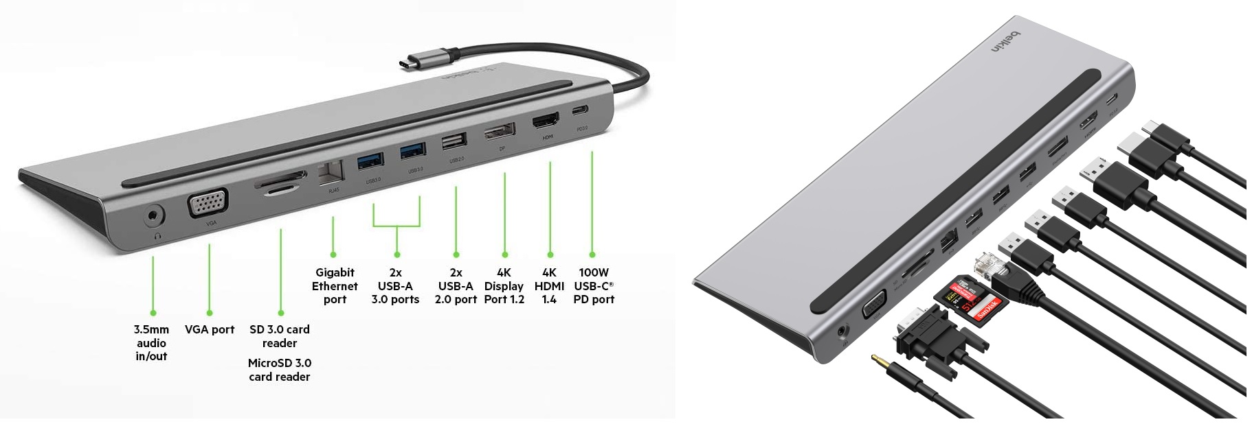 Belkin USB-C 11 в 1 2×HDMI / VGA / 2×USB-A / 2×USB-C / SD / microSD / Ethernet / 3,5 мм (код товару: INC014BTSGY) – максимальна гнучкість для багатомоніторних конфігурацій.