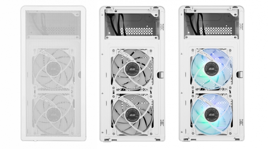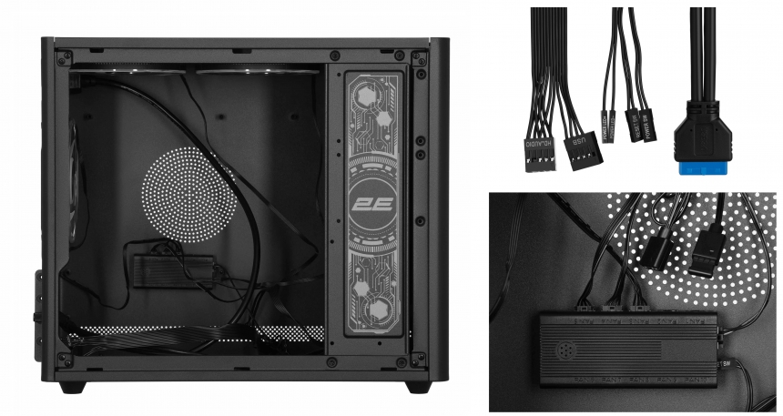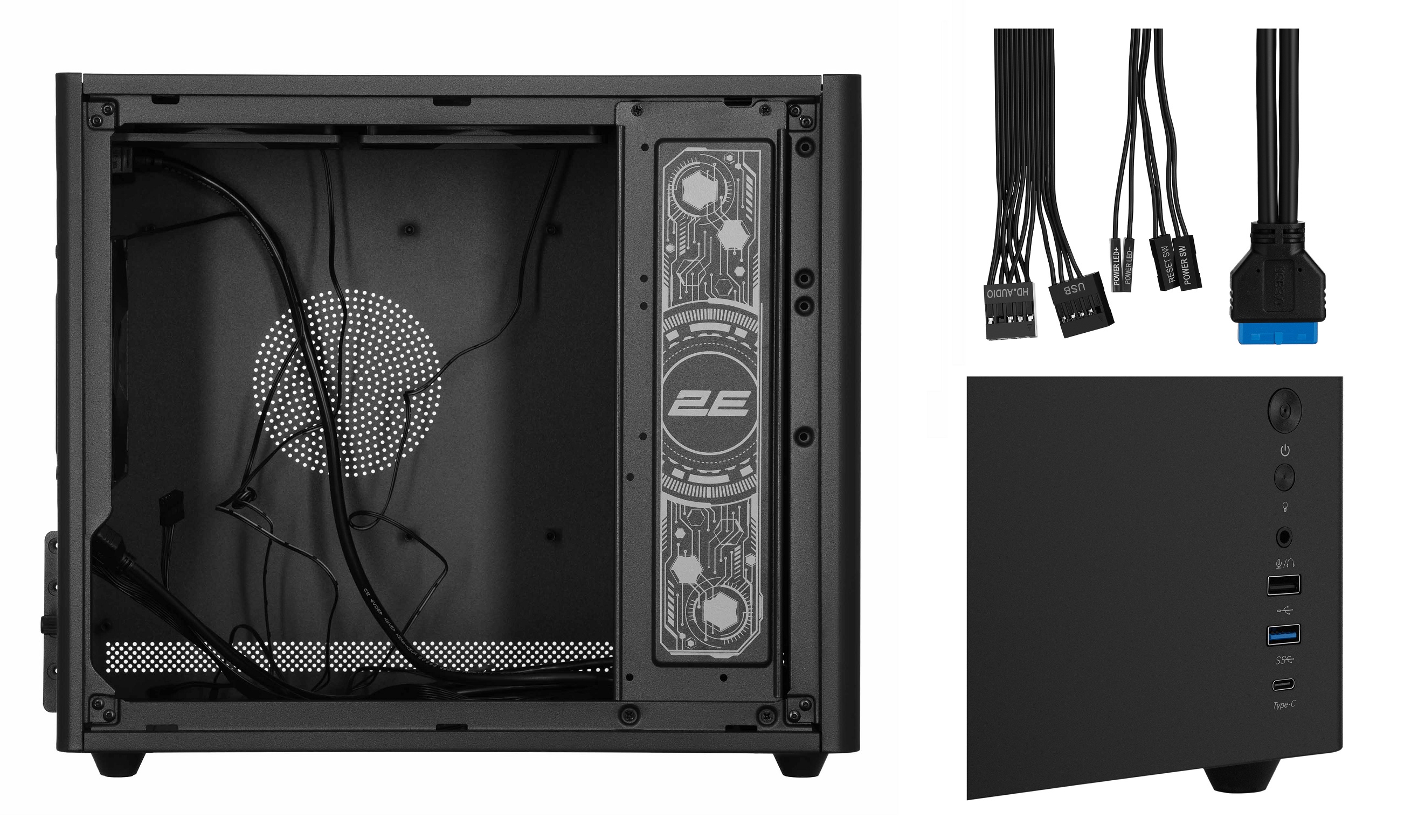 У стандартній комплектації корпус оснащено трьома 120-мм ARGB-вентиляторами (код товару: 2E-ACF120VB-ARGB), які розміщено на верхній і задній панелях. Можливо встановити двосекційну систему рідинного охолодження (240 мм) у верхній частині. Для підключення, керування і контролю комп’ютерної периферії на передній панелі вбудовано найнеобхідніші інтерфейси: 1 × USB3.0, 1 × USB 2.0, 1 × USB Type-C, HD AUDIO+MIC, кнопки та індикатори Power, LED, HDD LED.