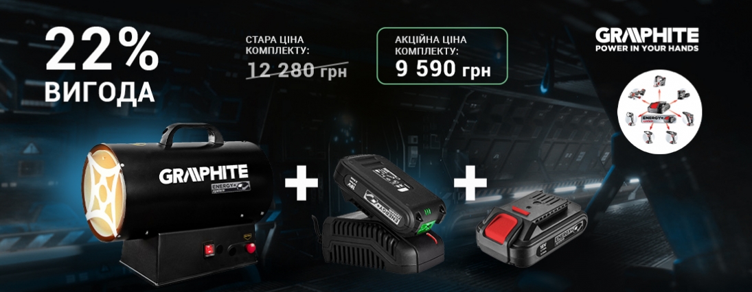 Купуйте комплект "Автономна теплова газова гармата Graphite 58GE100 + акумулятор GRAPHITE Energy + та зарядний пристрій GRAPHITE" за акційною ціною 9 590 грн* з вигодою 22%!
