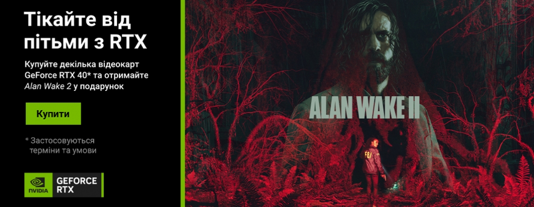 У разі придбання відеокарти або ПК 2E з GeForce RTX 40-ї серії кожен покупець отримує в подарунок гру Alan Wake 2!