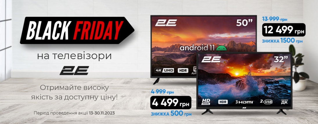 Цей час настав: у Black Friday знижено ціни на телевізори 2Е. Купуйте моделі 2E-32D3 та 2E-50A06K зі знижками 500 грн та 1500 грн відповідно.