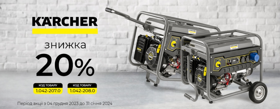 Зручність у використанні. Користувачі, безсумнівно, гідно оцінять практичність генераторів Karcher. До каркаса прикріплено зручне складане руків’я для переміщення. Великі колеса забезпечать маневреність і легке транспортування перетятою місцевістю.