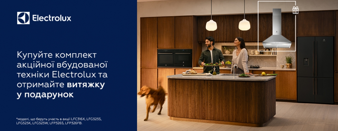 Купуйте комплект акційної вбудовуваної техніки Electrolux та отримайте витяжку як подарунок! В акції беруть участь усі моделі варильних поверхонь і духових шаф.