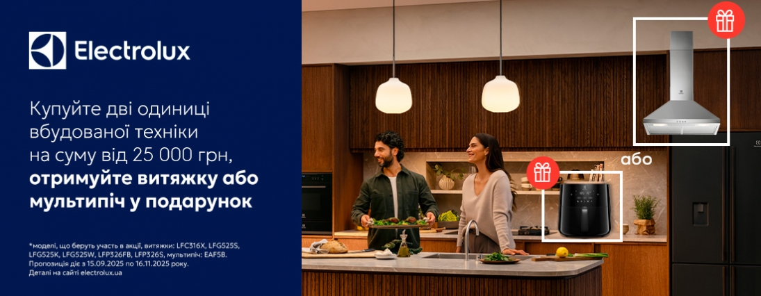 Купуйте дві одиниці вбудованої техніки на суму від 25 000 грн й отримуйте одну з витяжок або мультипіч як подарунок.