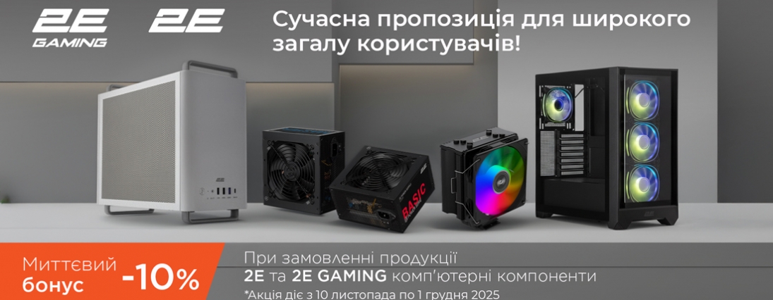 Актуальний асортимент продукції 2Е комп’ютерні компоненти: корпуси, блоки живлення, системи охолодження для процесора та аксесуари.