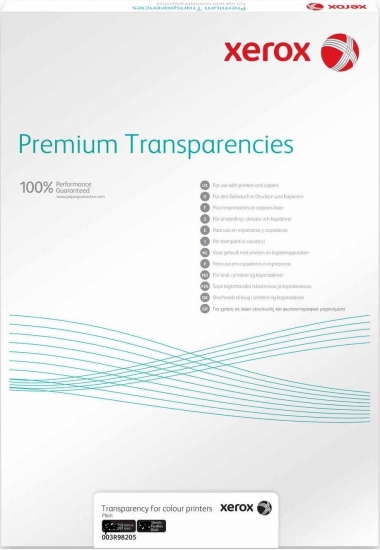 Асортимент плівок Xerox Premium спеціально розроблений, щоб забезпечити широку сумісність, повний спектр форматів та високу якість. На прозорі плівки XEROX зображення наноситься так само легко, як на звичайний папір. Плівки XEROX надають яскравого, живого кольору та чіткого чорного тексту – за допомогою цих плівок ви можете створити найефектніші документи! Термостійкий матеріал основи гарантує відсутність спотворень під час друку. Спеціальні види та відмінна взаємодія з будь-якою технологією друку, чудові кольори. Спеціальна антистатична обробка забезпечує відмінні прогінні властивості.