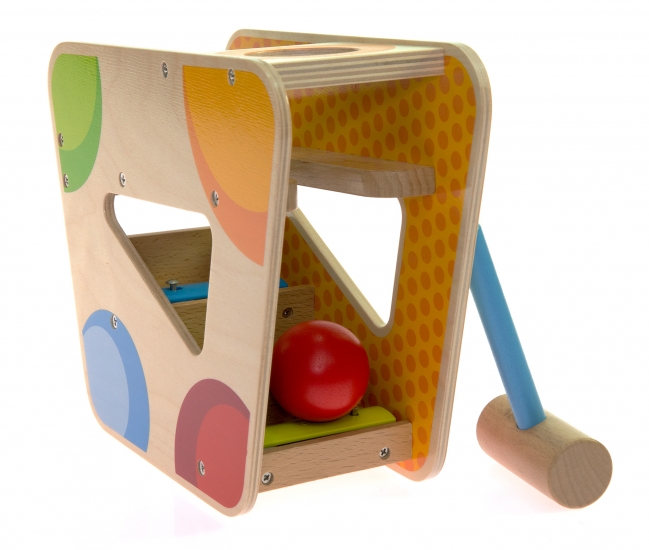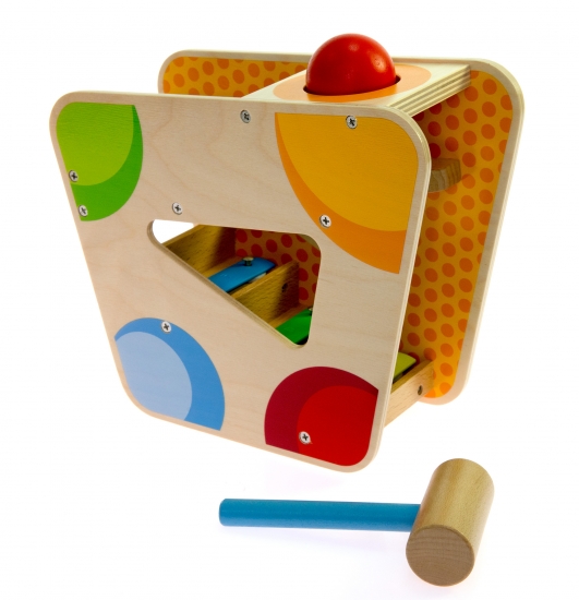 Дитячий дерев’яний сортер з ксилофоном німецького виробника іграшок goki – це справжня музична знахідка для найменших. Пристрій складається з яскравої дерев’яної форми, молоточка і червоної кулі. Щоб почути мелодію ксилофону, необхідно покласти кулю у отвір зверху і, приклавши зусиль, стукнути по ній молоточком. Після цього куля впаде в жолоб, скотиться і пройдеться музичними сходами сортера. «Музична куля» - це чудова гра для дітей, що допоможе розвинути координацію, сприйняття кольору та звуку, логічність та послідовність дій.