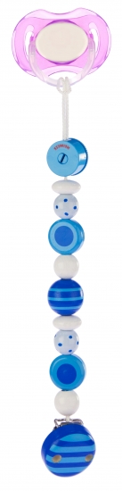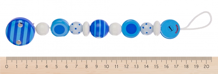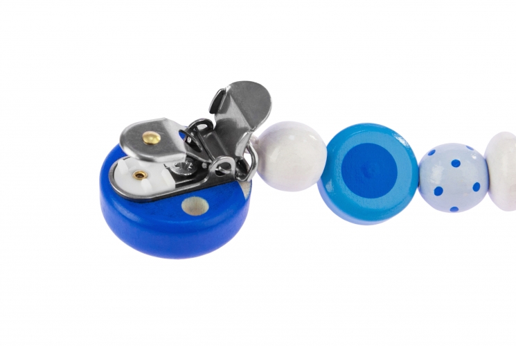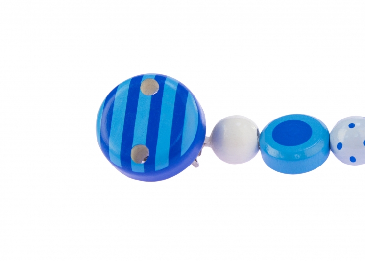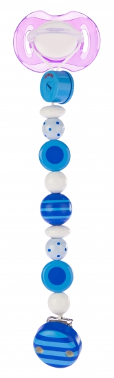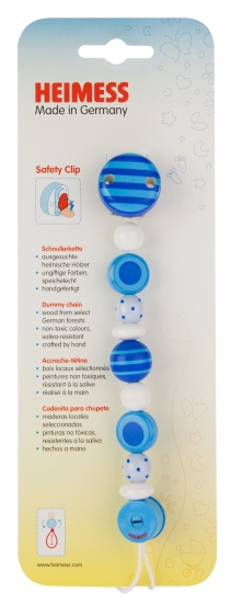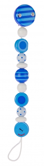 Дерев’яна кліпса для пустушки «Сині смуги» від німецького бренду Heimess. Вона допоможе дитині не загубити і не забруднити свою пустушку. Коли дитина підросте, аксесуар виконуватиме роль розвиваючої іграшки. Завдяки спеціальній кліпсі хлопчик розвиватиме зір, відчуття форм, дрібну моторику, координацію рухів. Аксесуар представлений у вигляді ланцюжка із фігур з різноманітними візерунками. Усі елементи вироблені із натуральної деревини, яка просочується нетоксичними фарбами на водній основі.