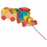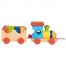 Потяг-каталка із натурального дерева, усі деталі якісно оброблені, фарби нетоксичні, яскраві та стійкі. Потяг – із двох частин: головного вагону і вантажного, вони поєднані гнучкою резинкою. У вантажному вагончику 10 геометричних фігур для конструювання перших споруд. Колеса обертаються, довжина мотузки 68 см. Довжина потяга без мотузки 32 см.