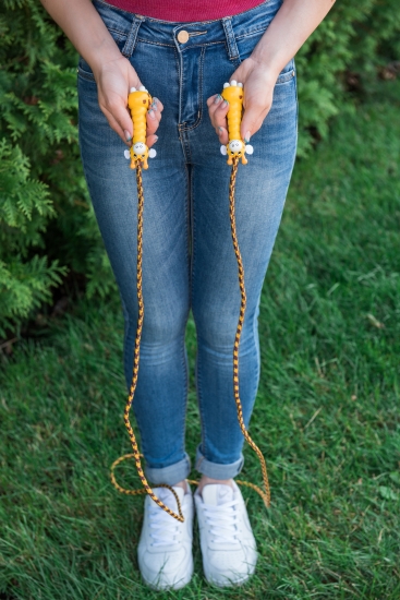 Міцна і яскрава скакалка із дерев’яними ручками-жирафами жовто-коричневого кольору.