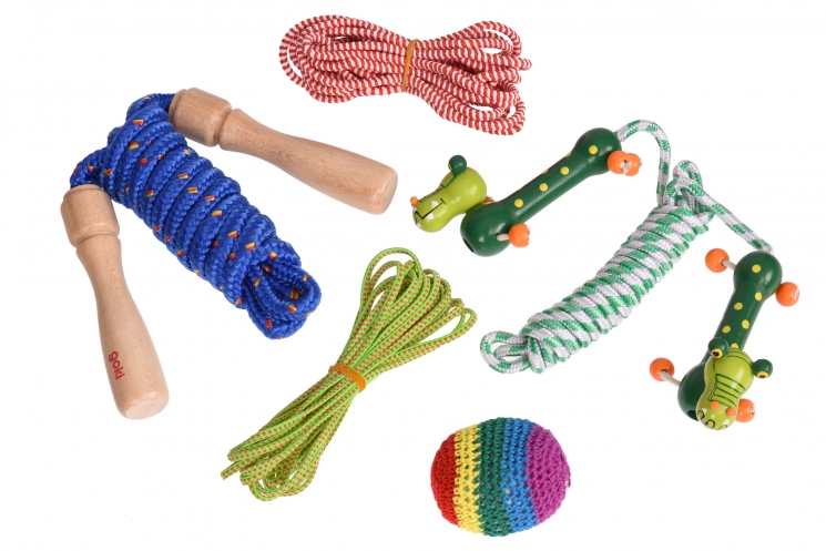 Німецький виробник іграшок goki піклується про фізичне здоров’я дітлахів з раннього віку, тому пропонує спортивні аксесуари для ігор. Серед них: в’язані м’ячі для гри сокс, скакалки, гімнастичні стрічки, резинки для стрибків.