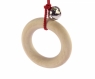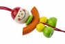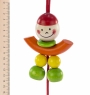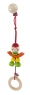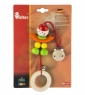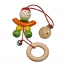 Кліпса закріплена на міцній фірмовій картонці. Вона вироблена із дерев’яних елементів різних кольорів: натурального, салатового, жовтого, помаранчевого та червоного. Якщо потягнути за кільце - іграшка потягнеться завдяки червоній гумці, що з’єднує фігурку та металеву кліпсу. На червоній текстильній мотузці є металевий дзвіночок. Дерев’яні елементи оброблені дуже якісно, вони вкриті фарбами на водній основі. Метал, з якого зроблений дзвіночок і кліпса – гіпоалергенний, тому аксесуар безпечний для здоров’я дитини.