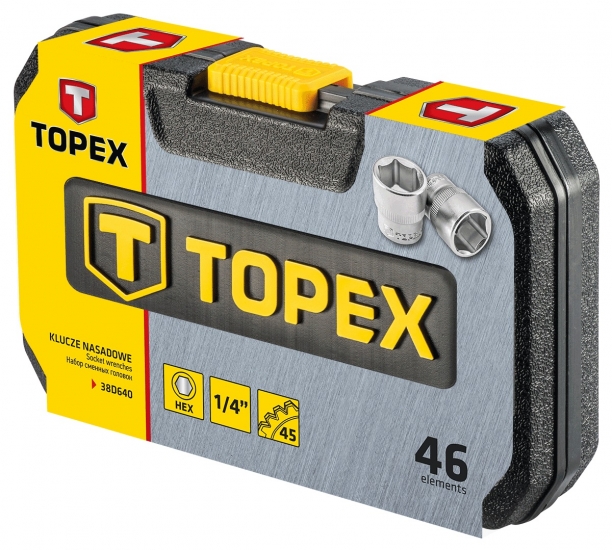 Набір торцевих ключів 1/4” TOPEX складається з 46 елементів, упорядкованих у зручній пластиковій валізці. Всі елементи виготовлені з високоякісної хромванадієвої сталі, що забезпечує подовжений термін експлуатації інструментів. У наборі представлені, між іншим, широка гама насадок, популярних викруткових наконечників на насадках, руків’я для наконечників і тріскотка. Набір широко застосовується у дрібних монтажних роботах, ремонті автотранспортних засобів і обладнання, а також інших роботах вдома та в гаражі кожного майстра. Марка TOPEX адресована майстрам, які займаються дрібним ремонтом.