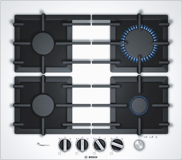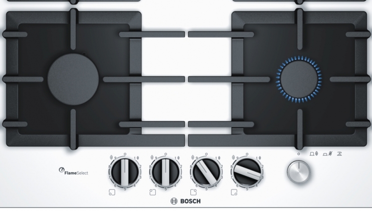Газова варильна поверхня Bosch має основу із загартованого скла, стильний дизайн, чавунні решітки, клинкові перемикачі та головний механічний вимикач. Девайс має 4 газові конфорки: 1 потужна, 2 стандартні та 1 економічна. Особливістю варильної поверхні є технологія FlameSelect (9 рівнів потужності з точним керуванням розміру полум’я). Така варильна поверхня є ідеальним рішенням для сучасної кухні.