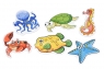 «Мешканці океану» - яскравий різнобарвний пазл для найменших діток. Деталі доволі великі, виробник рекомендує набір для діток від 18 місяців. У наборі деталі для складання 6 фігурок. Деталі виготовлені з цупкого, твердого картону. Їх можна складати необмежену кількість разів і вони не деформуються. Зображення нанесене нетоксичними фарбами.