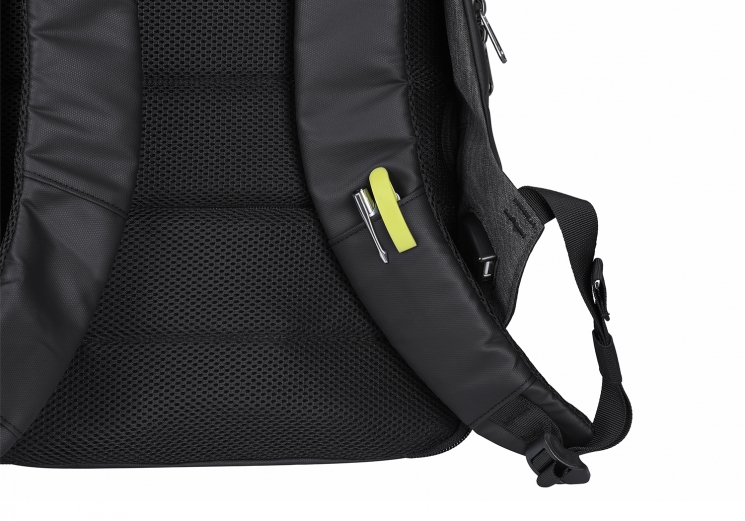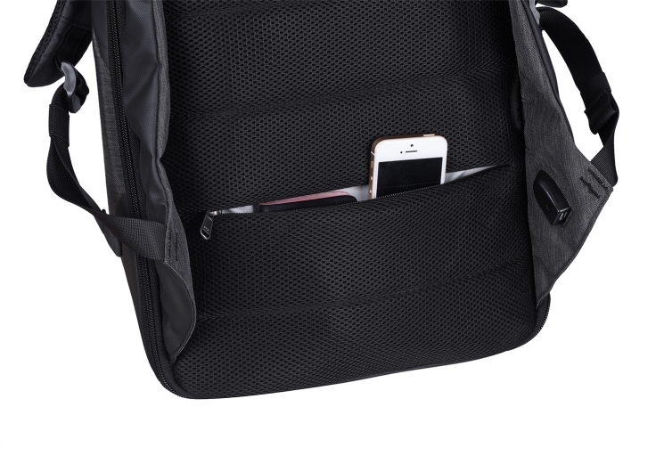 Рюкзак зроблено з практичних та надійних матеріалів. Водовідштовхуюча тканина захистить речі та техніку від вологи, а амортизуюча внутрішня частина - від пошкоджень при падінні та поштовхах. В цій моделі використовується металева фурнітура. У рюкзак поміститься ноутбук, планшет, зарядний пристрій, документи та особисті речі. Рюкзак оснащений USB-портом для зручного використання портативної батареї. Додатковий захист забезпечує кодовий замок TSA. Для транспортування є ручка та регулюємі плечові лямки з амортизуючими накладками. Для зручності передбачена ортопедична спинка.