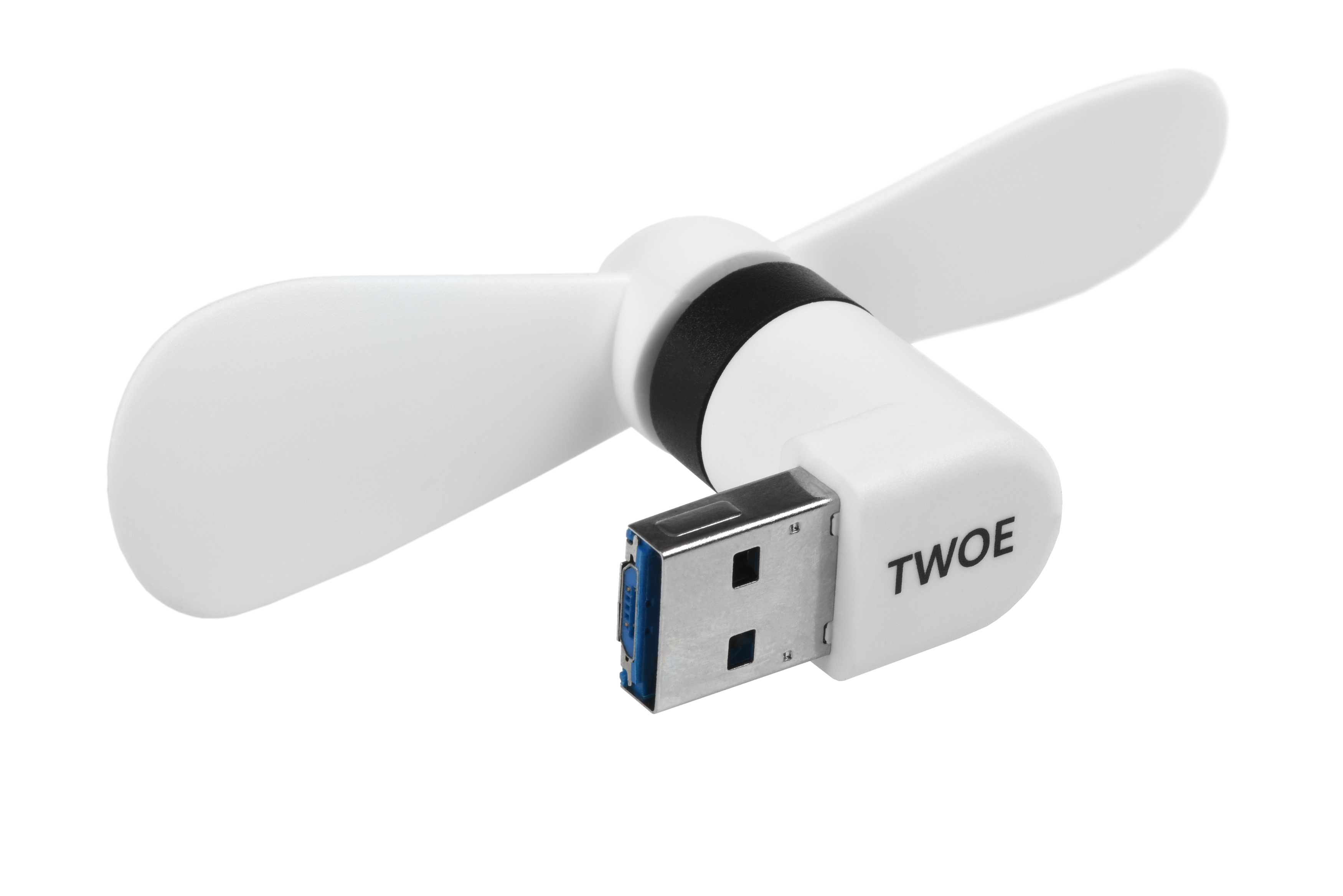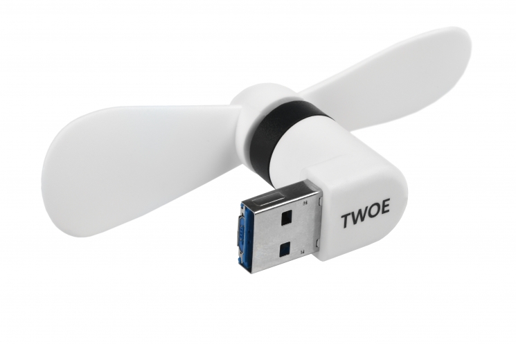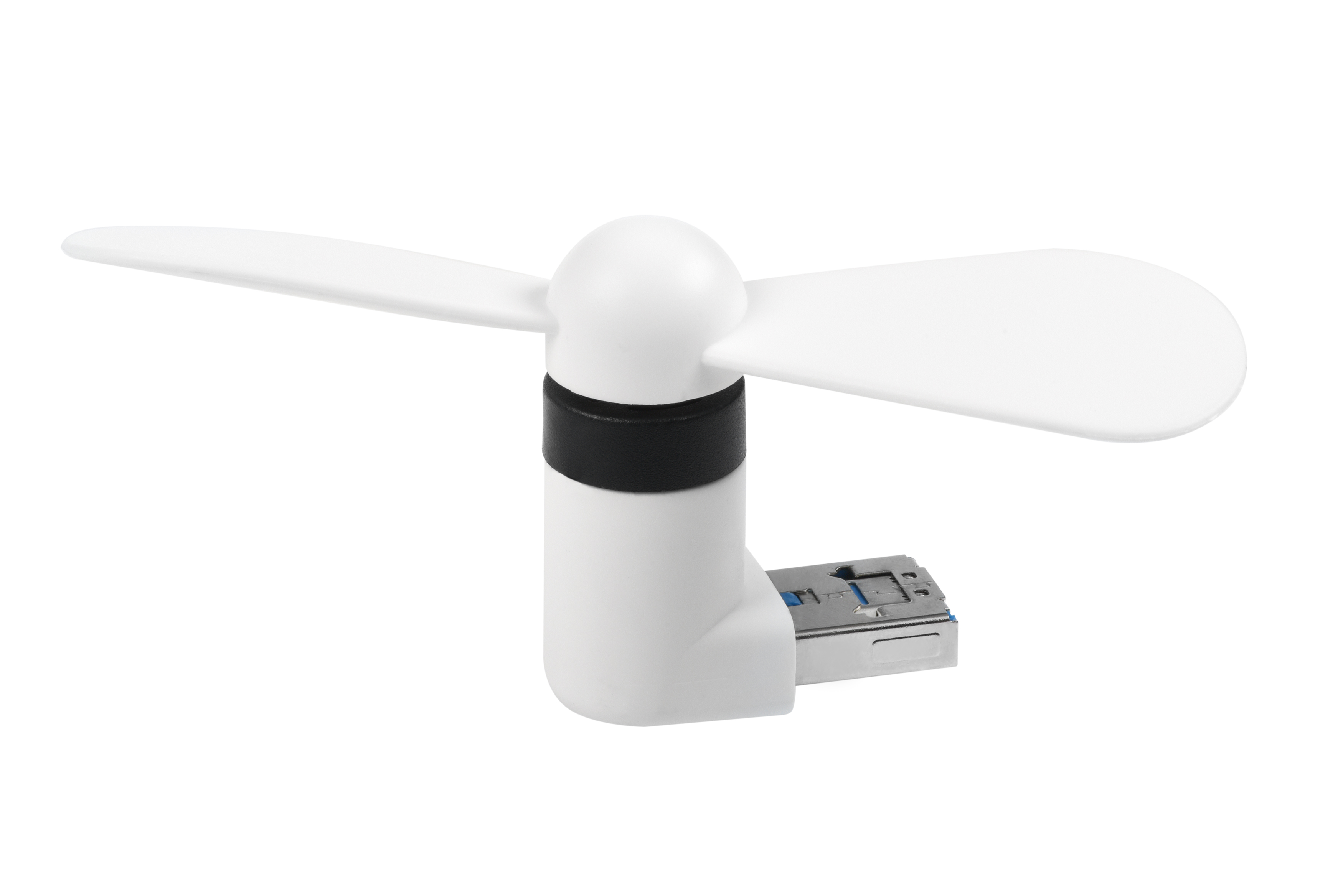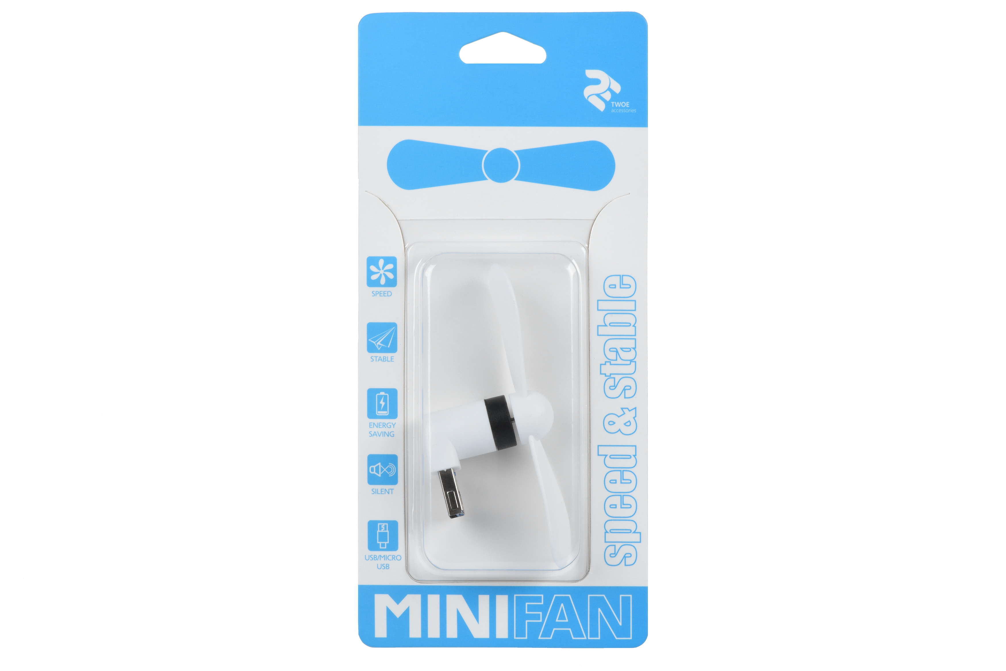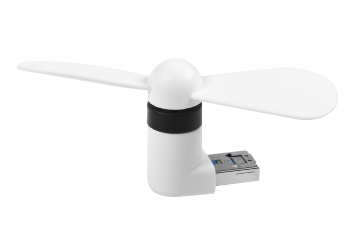 Тип: портативний вентилятор; Живлення: USB/ microUSB; Кількість лопатей: 2; Розмах лопатей: 9 см; Колір: білий.