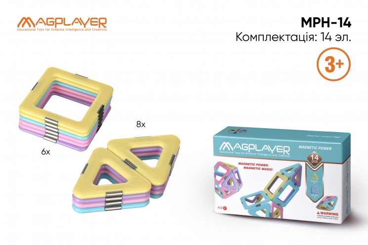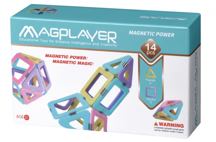 Набір Magplayer складається зі 14 деталей, з яких можна побудувати велику кількість моделей, якщо проявити креативність. Елементи виготовлені з міцного, надійного, та при цьому нетоксичного пластику. Всі деталі якісно відточені і добре стикуються і роз’єднуються між собою завдяки намагніченим граням. Також у наборі є інструкція, спеціально адаптована для дітей. У ній детально і при цьому просто і доступно показані варіанти моделей, які можна зібрати.