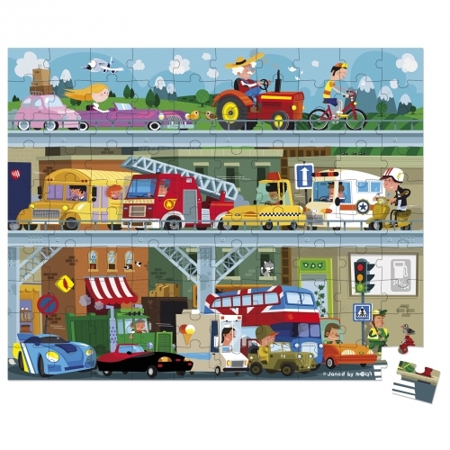 Деталізований пазл із численними транспортними засобами точно сподобається всім хлопчикам. Пазл складається зі 100 деталей; вони картонні, цупкі і дуже якісні. Весь набір у стильній валізці з ручкою. Картинка яскрава: дитина довго і захопливо розглядатиме її, вивчаючи нові явища, слова. Різноманітність транспортних засобів на картинці вражає: тут і шкільний автобус, і Лондонський двоповерховий автобус, і фургон з морозивом, і ретро-кар, і військовий автомобіль, і різні засоби спецтехніки. Іграшка для розвитку моторики рук, уважності, пам’яті у дітей. Рекомендований вік: 5+.