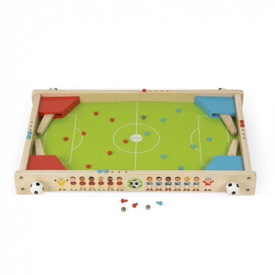 Організовуй футбольні змагання з друзями разом з настільним футболом-пінболом від французького виробника Janod. Мета гри відома і зрозуміла всім – забити якомога більше голів супернику. Гра постачається разом з 3-ма металевими і 10 дерев’яними стіками у наборі, по 5 кожному гравцю. Кольорові дерев’яні стіки – це уявні футболісти, які необхідно встановити на своїй половині поля. Для захисту воріт необхідно рухати фліперами, як у пінболі. Для цього використовуємо бокові важелі у вигляді футбольних м’ячів. Рекомендований вік: 3+
