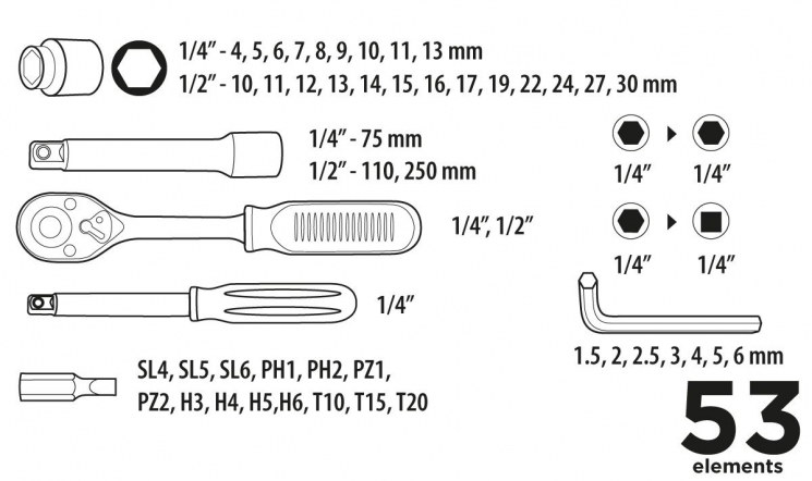 Універсальний набір ручного інструменту Top Tools 38D500, що складається з 73 предметів, упакованих у міцний пластиковий кейс. Набір призначений для виконання всіх найпоширеніших завдань по дому. Складається з 73 елементів розмірами 1/4" та 3/8". В комплект входить повний набір шестигранних головок двох розмірів, тріскачка та аксесуари, що дозволяють виконувати більшість механічних робіт. Універсальність набору підкреслюється наявністю комбінованих ключів, столярного молотка, шестигранних ключів та викруток. Інструменти поміщені в зручний та міцний пластиковий кейс.