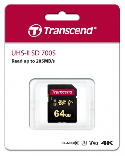 Карти пам'яті Transcend SDXC/SDHC 700S відповідають як стандарту UHS-II Speed Class 3 (U3), так і вимогам UHS Video Speed Class 90 (V90) для запису відео у форматі 8K Ultra HD, забезпечуючи швидкість читання та запису до 285 і 220 МБ/с, відповідно.