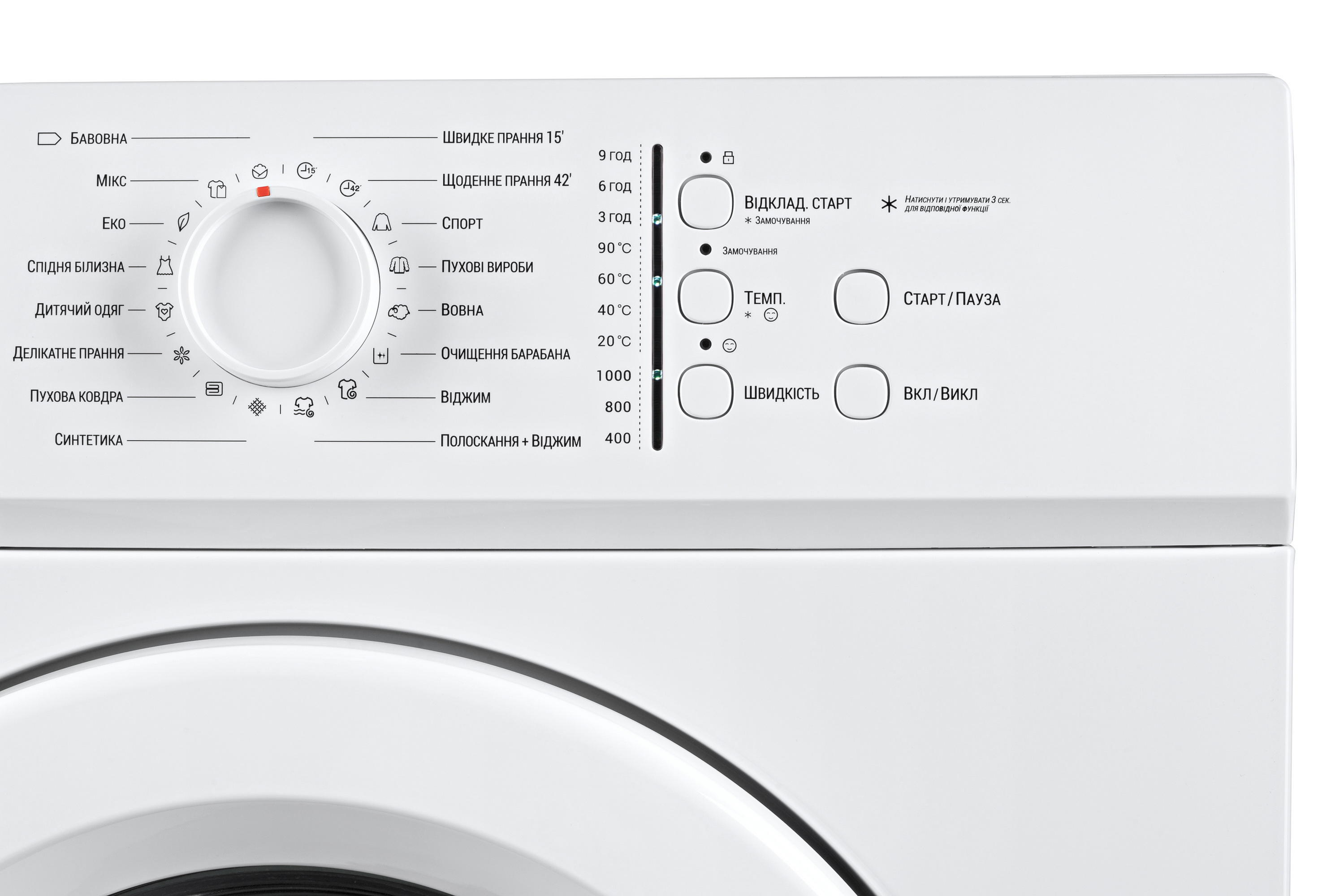 Вибір температури води – 20°C, 40°C, 60°C, 90°C. Присутні режими відкладеного прання, очищення барабана та функція блокування від дітей. Стерилізація барабана здійснюється водою з температурою близької до кипіння.