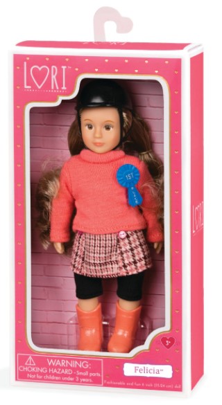 Оригінальна лялька-жокей Феліція від бренда LORI – дуже цілеспрямована, вона звикла завжди бути першою – «Я ношу свою стрічку переможця з гордістю!». Лялька сумісна з іншими іграшками LORI та чудово доповнить вашу колекцію. Верхова їзда навчає Феліцію дисципліні, силі та наполегливості – тож граючи з лялькою, малюк буде розвивати свої особисті якості та посидючість. У комплекті ви знайдете: ляльку, пару взуття, легінси, спідницю, светрик, шолом та резинку для волосся. Лялька виготовлена з вінілу та має м’яке наповнення. Висота іграшки 15 см. Рекомендований вік: 3+.