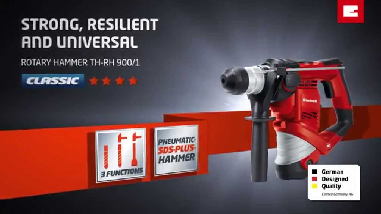 Новий перфоратор Einhell TC-RH 900 з SDS-Plus патроном призначений для свердління з биттям в бетоні, камені і цеглі. Також основне призначення перфоратора - це роботи, пов'язані з довбанням зубилом або долотом. Додаткова рукоятка перфоратора Einhell TC-RH 900 з ребрами для надійної фіксації, а також наявність запобіжної муфти забезпечують додаткову безпеку під час роботи.