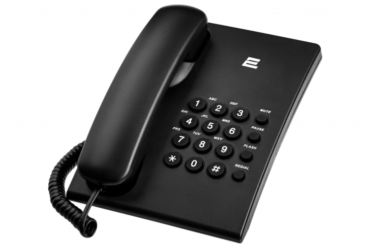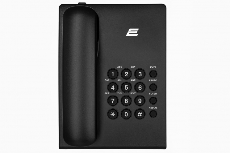 Класичний аналоговий телефон чорного кольору з однією трубкою.