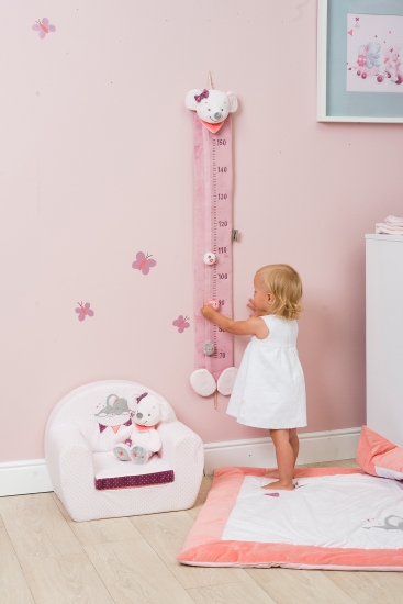 Ростомір для дитячої кімнати серії Nattou Адель та Валентина. Виготовлений з текстилю – безпечного і м’якого на дотик поліестеру. Розмітка розрахована до 150 см, вона просто кріпиться до стіни за допомогою петлі. На ростомірі є 3 позначки для фіксації зросту дитини.