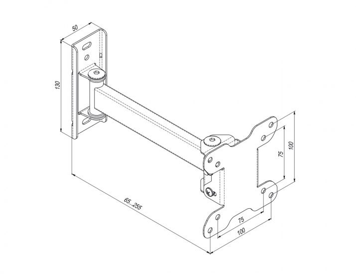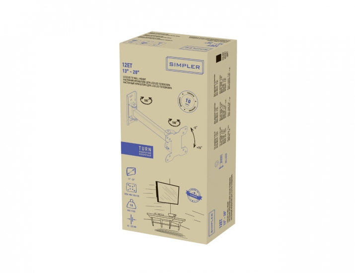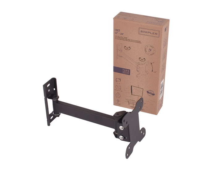 Настінний похило-поворотний кронштейн Simpler 12ET. Що потрібно знати, щоб правильно підібрати кронштейн до телевізора? Діагональ екрану, вага телевізора та стандарт кріплення VESA - відстань між кріпильними отворами на задній панелі телевізора. Всю цю інформацію ви легко знайдете в характеристиках вашого телевізора, на упаковці або в інструкції. Кронштейн підходить для плазмових, LCD, LED телевізорів і моніторів з діагоналлю 13-28 дюйма і вагою до 15 кг. Підтримуваний стандарт VESA: від 75×75 мм до 100×100 мм.