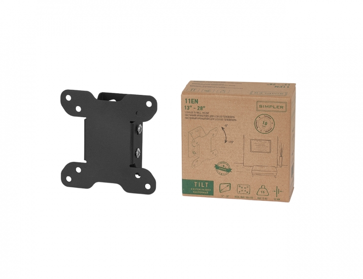 Настінний похилий кронштейн Simpler 11EN. Що потрібно знати, щоб правильно підібрати кронштейн до телевізора? Діагональ екрану, вага телевізора та стандарт кріплення VESA - відстань між кріпильними отворами на задній панелі телевізора. Всю цю інформацію ви легко знайдете в характеристиках вашого телевізора, на упаковці або в інструкції. Кронштейн підходить для плазмових, LCD, LED телевізорів і моніторів з діагоналлю 13-28 дюйма і вагою до 25 кг. Підтримуваний стандарт VESA: від 75×75 мм до 100×100 мм.
