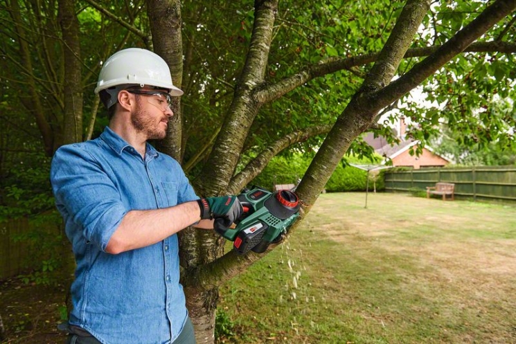 Акумуляторна ланцюгова пила 18 В - легкість, компактність і універсальність. Мала маса, компактність і маневреність для ефективного підрізування в різних положеннях; маса всього 3 кг з акумулятором. «Стабілізуючий накінечник із захоплюючими зубами» захоплює деревину, забезпечуючи чисте підрізання і зводячи до мінімуму пошкодження гілок. Проста система SDS, яка прискорює збірку, натяг ланцюга і обслуговування.