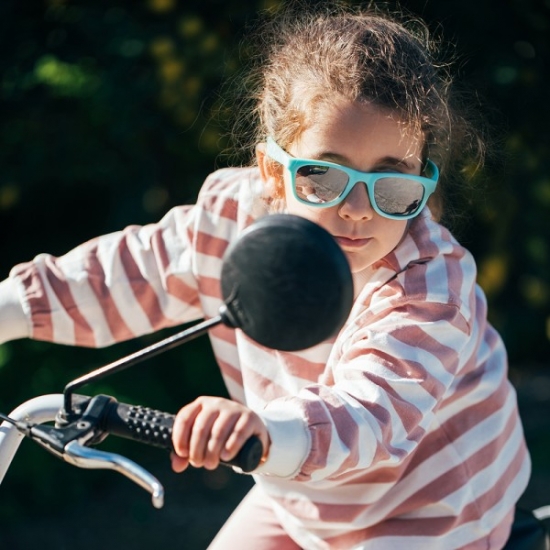 Дана модель має гнучку оправу м'ятного кольору та дзеркальні лінзи, виготовлені з ударостійкого незламного полікарбонату, мають сертифікацію 1 оптичного класу й 3 категорію затемнення/прозорості лінз (відповідно до європейських (EN 1836-1997), американських (ANSI Z80.3-1996) й австралійських (AS 1067.1-1990) стандартів) – інтенсивний 100% захист від шкідливого UV-A, UV-B і UV-C сонячного випромінення. Модель може використовуватися на пляжі й в інших місцях, де очі дитини потребують захисту від шкідливих сонячних променів. Всі сонцезахисні окуляри KOOLSUN доповнені мікрофібровим мішечком для зберігання.