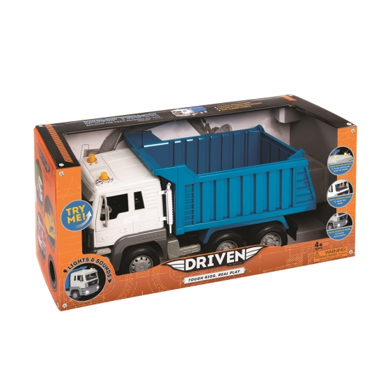 Великий Самоскид від Driven з білою кабіною і синім кузовом стане чудовим подарунком для маленького любителя спецтехніки. Міцність і вантажопідйомність - ось ті якості, завдяки яким ця машина відразу звертає на себе увагу. Машинка багатофункціональна: дверцята відкриваються, кабіна та кузов відкидаються, в міні-самоскиді наявні реалістичні м’які гумові шини та світлові ефекти. Також міні-самоскид працює від батарейок типу AG13 (в комплекті). Іграшка вироблена із якісної і міцної пластмаси. Рекомендований вік: 4+