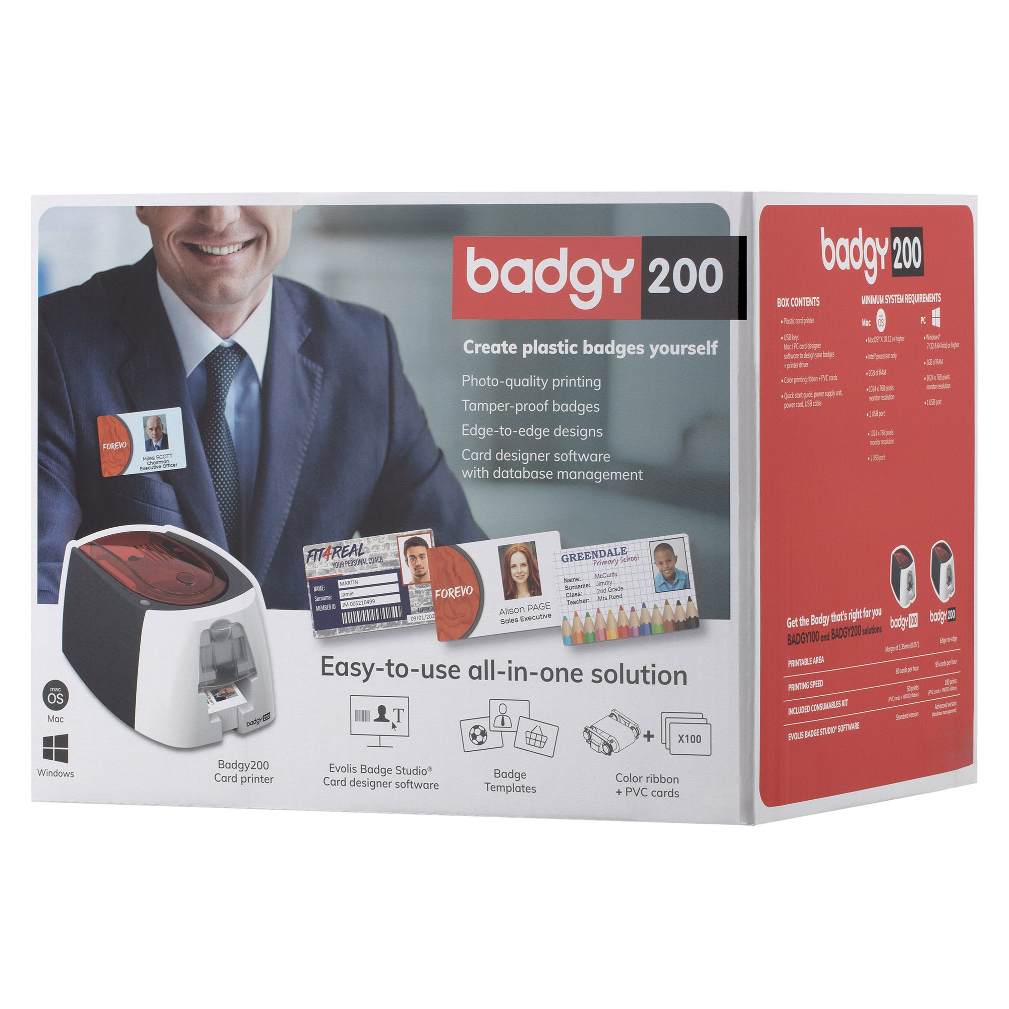 Badgy є готовим рішенням для PC або MAC, що складається з карт-принтера, програмного забезпечення для персоналізації карт Evolis Badge Studio® і комплекту витратних матеріалів на 100 відбитків (кольорова стрічка і чисті пластикові карти).