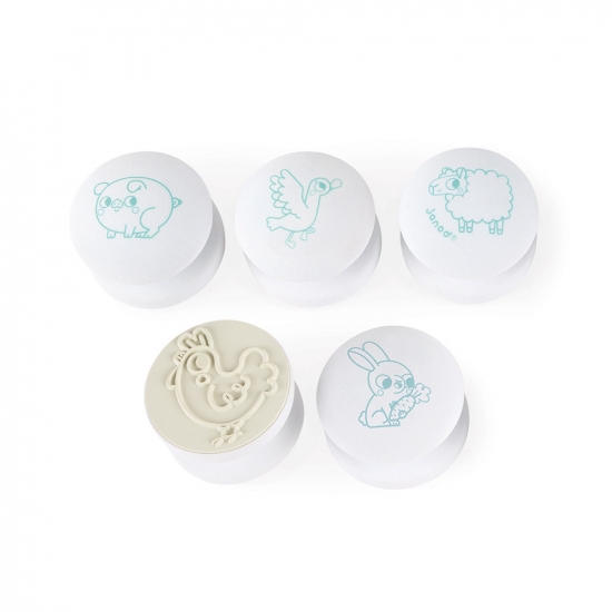 Набір для творчості Штампи Смайли від французького бренду Janod містить лист з 50 невеликих, попередньо вирізаних, пінопластових штампиков з різною графікою, на тему емоцій і в тому числі милих тварин, веселки, сердечок, делікатесів і єдинорогів. Штампи зроблені з приємного на дотик еластичного пінопласту і гумової поверхні, на якій нанесено зображення штампування. У набір також входять три маленькі чорнили у вигляді маркерів: блідо-рожевий, темно-рожевий і блакитний. Завдяки їм один штампик може бути пофарбований в кілька кольорів одночасно. Також в комплекті є коробка, в якій можна зберігати штампи і фарбу.