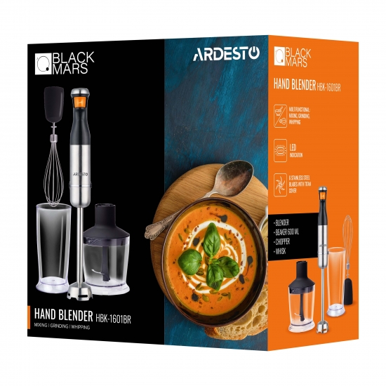 Ергономічний корпус блендеру виконано з міцного софт-тач пластику чорного кольору та вставок з шліфованого металу. Ножі вироблені з міцної та надійної нержавіючої сталі. Передбачено захист від бризок, а титанове покриття забезпечує ідеальну заточку лез протягом тривалого часу користування. Двигун з потужністю 900 Вт захищено від перегріву. Передбачено п’ять режимів швидкості з індикацією на ручці. За рахунок продуманої конструкції пристрій працює з досить низьким рівнем шуму.