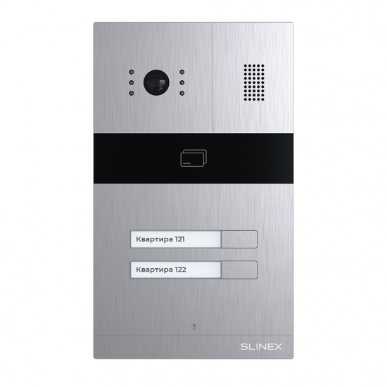 Slinex MA-02 – це панель виклику на 2 абонента в ультрасучасному дизайні. Панель має безліч переваг, серед яких: кольорова CMOS камера з роздільною здатністю 960 ТВЛ, вбудований комбінований зчитувач безконтактних карт EM-Marin, Mifare/NFC, механічний інфрачервоний фільтр на 6 світлодіодів та підсвічування іменних табличок.