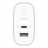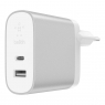 Мережевий ЗП Belkin BOOST ^ CHARG USB-C with Power Delivery (27W, 3.0A) + USB-A (2.4A, 12W), Silver - 2-портове домашнє зарядний пристрій USB-C і USB-A, спеціально розроблене для смартфонів і планшетів з USB Power Delivery, для більш швидкої зарядки. Налаштований для підтримки швидкої зарядки iPhone, він може перезаряджати батарею iPhone X, iPhone 8 або iPhone 8 Plus до 50% за 30 хвилин, використовуючи кабель Apple Lightning - USB-C. Порт USB-C також забезпечує максимально швидку зарядку для інших смартфонів і планшетів з підтримкою PD до 27 Вт. Другий порт (USB-A) забезпечує 12 Вт для швидкої зарядки застарілих пристроїв одночасно.