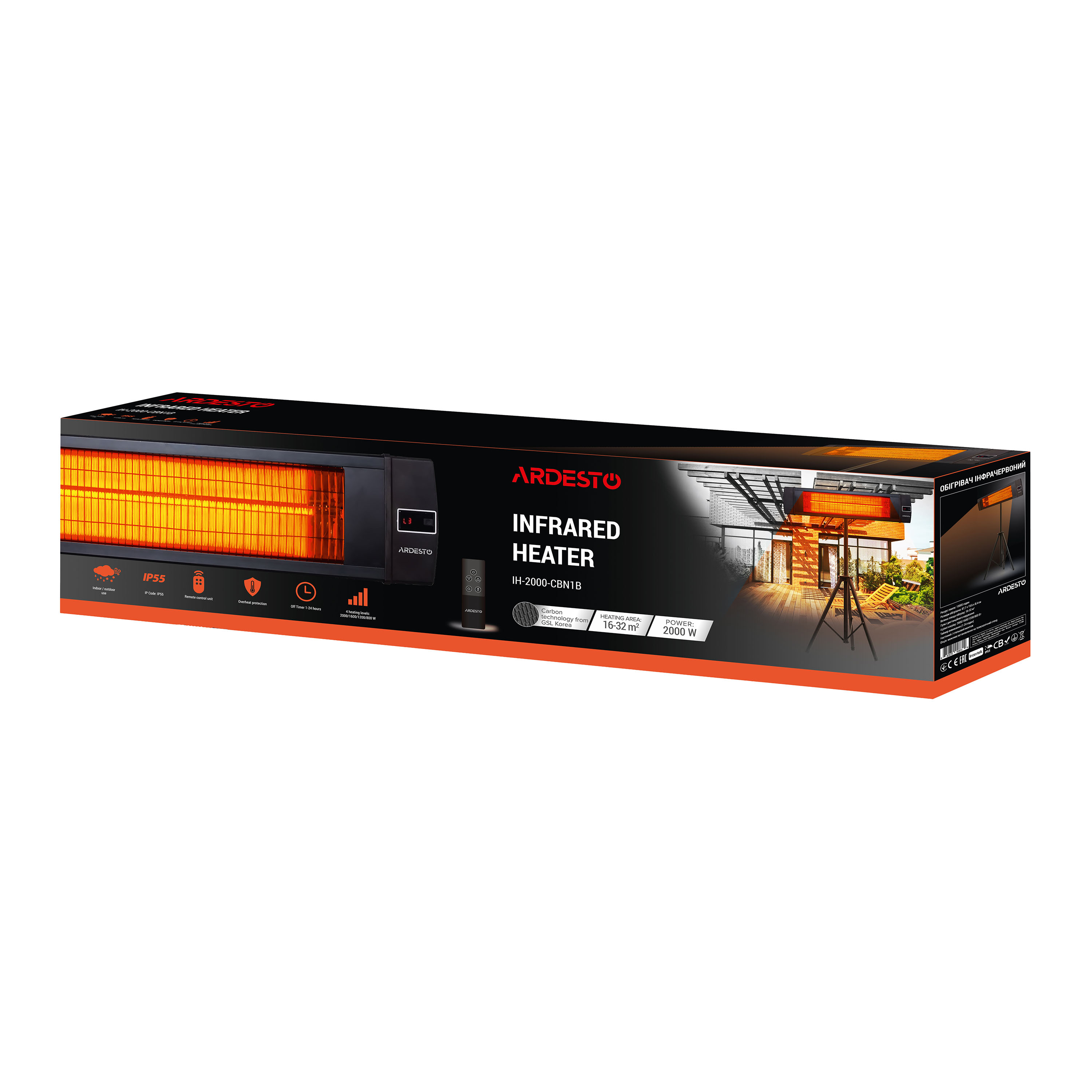 Обігрівач отримав захист від струменів води та пилу за стандартом IP55. Це дозволяє використовувати пристрій як у приміщені, так і на вулиці. Дюралюмінієвий корпус покрито термостійкою порошковою фарбою, а лицьова панель з нагрівальним елементом захищена хромованою решіткою. Ardesto IH-2000-CBN1B продається без стенду. Телескопічний стенд IH-TS-01 дозволяє регулювати висоту від 1,1 до 1,8 м. Конструкція обігрівача також підтримує настінний та стельовий монтаж. Для дистанційного керування є пульт.